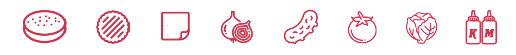 Potato Bun, frisch gesmashte Patties, Cheddar Käse, frische Zwiebeln, Gewürzgurken, Salat, Tomate, Ketchup, Mayo.